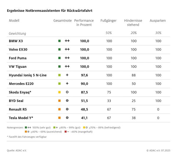 Viele dieser Fälle lassen sich durch moderne Technik verhindern, wie ein aktueller Systemvergleich des ADAC zeigt. Der Mobilitätsclub hat zehn verschiedene Fahrzeuge mit Notbremsassistenten (AEB) für das Rückwärtsfahren untersucht. Die Autos mussten in verschiedenen Fahraufgaben stehende und bewegte Hindernisse erkennen und vor einem Zusammenprall automatisch abbremsen.